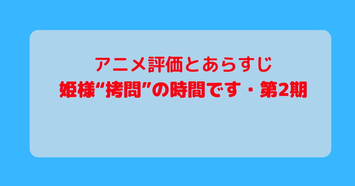 2026年アニメ 2026年冬アニメアニメ評価姫様“拷問”の時間です アニメ「姫様“拷問”の時間です・第2期」最新話まで見た感想と評価・あらすじ 2026年アニメ 2026.03.212026.03.28 記事内に広告が含まれています。 魔王軍に囚われた姫様が拷問に屈するために頑張る平和なお話。魔族との素敵な関係に思わずほんわかします。 スポンサーリンク 各話感想 姫様“拷問”の時間です 第2期・13話(2期の1話)感想とあらすじ姫様“拷問”の時間ですは、囚われた姫様から情報を引き出すためにあれやこれや拷問をする平和な飯テロです。記憶喪失になった姫様囚われている中で記憶喪失になった姫様。拷問に屈していた記憶も失い、自信満々に騎士としての振る舞いを見せます。そんな姫様... 姫様“拷問”の時間です 第2期・第18話感想とあらすじ拷問に現れるマオマオちゃん。その裏で魔王様は口内炎になって大騒ぎに。マオマオちゃんと幸せな拷問今回拷問にやってきたのはマオマオちゃん。姫様は屈する気まんまん。拷問が始まる前から、何を話そうか考え始めます。そんな中始まったマオマオちゃんの拷問... 姫様“拷問”の時間です 第2期・第19話感想とあらすじなんと今回は、珍しく拷問失敗がありました。まともに失敗するのははじめてでは、、、?拷問官を目指すサクラの口から語られた、拷問は人を楽しませることという言葉。拷問という言葉と楽しませるがあまりにミスマッチすぎて、思わず耳を疑いました。拷問官を... 姫様“拷問”の時間です 第2期・第20話感想とあらすじ拷問の職場体験職場体験でマオマオちゃんたちが拷問に来て喜ぶ姫様。どう見ても秘密を話す気満々。マオマオちゃんひとりでも屈するのに人数が増えたら屈しないはずがないと自己分析する姫様。その通りすぎますが、あらがう意志がなさ過ぎて笑えます。拷問で始... 姫様“拷問”の時間です 第2期・第21話感想とあらすじついに姫様とサクラが再会。捕虜と拷問官の関係なのに、優しい空間が出来上がります。姫様の拷問対策屈しそうになったら雷魔法を撃てとエクスにアイテムを渡す姫様。そして開幕から屈しそうになる姫様に即発動。魔族の拷問よりよっぽど拷問ぽいことしてない、... 姫様“拷問”の時間です 第2期・第22話感想とあらすじ姫を救いに来た騎士姫を救いに来た騎士の登場。姫の寝ているところにやってくる姿は完全に不審者。心が純粋な相手にしか触れられない魔法のせいで、姫様に触れないの面白すぎる、、、しかも明らかに姫様の心がきれいではないのが原因なのに、魔法が失敗とか言... 姫様“拷問”の時間です 第2期・第23話感想とあらすじ今回は姫様への拷問はなし。かわりにメリテロたっぷりで視聴者への拷問がひどい。こんなの見せられたら朝マックに行くしかない。サービスエリアも行きたい、、、魔王様の休日出勤魔王様がリクダイニングで車に乗る理由が面白すぎる。頭が突き刺さって車に穴が...