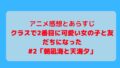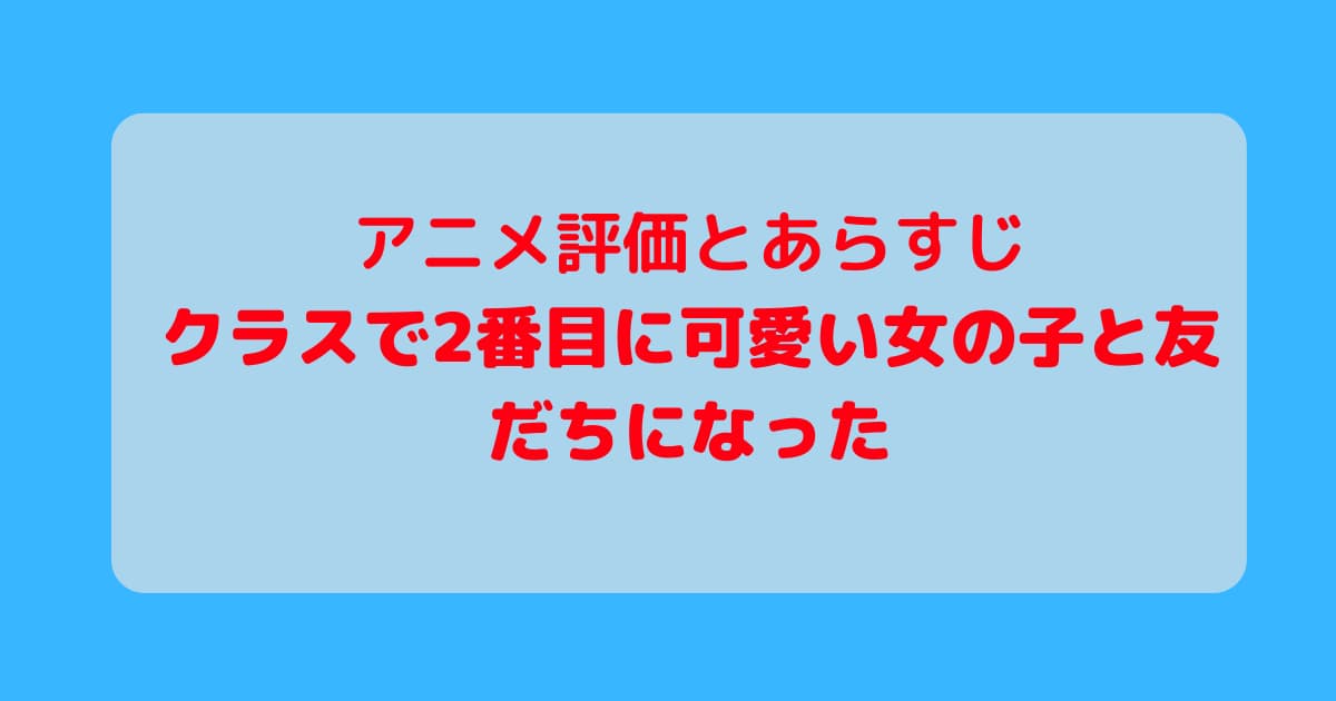 2026年アニメ 2026年春アニメアニメ評価クラスで2番目に可愛い女の子と友だちになった アニメ「クラスで2番目に可愛い女の子と友だちになった」最新話まで見た感想と評価・あらすじ 2026年アニメ 2026.04.15 記事内に広告が含まれています。 目次 感想各話感想#1「朝凪海という女の子」#2「朝凪海と天海夕」 スポンサーリンク 感想 海の反応がいちいち可愛くて好き。というかこれで付き合っていないのは無理がない? 前原に夕が接近した時のムッとした海が可愛い。友達は自分だけと思っていて、他の友だちができそうで嫉妬しているのでしょうか?独占欲ですね。 各話感想 #1「朝凪海という女の子」 クラスで2番目に可愛い女の子と友だちになった#1「朝凪海という女の子」感想とあらすじ・評価海が可愛すぎる。もうどう見ても付き合ってますよねこれ、、、?ずっとこの空気感で行ってほしい。公開処刑すぎる自己紹介自己紹介が痛々しい、、、週末楽しみにしてることとかこんな長く聞かれることある、、、?公開処刑すぎる、、、空気が重い中で、ひとり... #2「朝凪海と天海夕」 クラスで2番目に可愛い女の子と友だちになった#2「朝凪海と天海夕」感想とあらすじ・評価告白される海告白をキッパリ断る朝凪海。突然の天海夕の連絡先ゲット笑える。告白現場を見されてもさっぱりしてる海いい。本音を言い合う関係好き。ゲームが始まるときの海の表情をあえて映さなかったように見えましたが、どんな表情をしていたのでしょうか、... 2026春アニメおすすめ一覧【視聴済みアニメの感想と評価まとめ】2026年春アニメを22作品視聴した中からおすすめのアニメをまとめました。【Sランク】殿堂入りダイヤのA actⅡ -Second Season- #1「その先へ」ついにエースナンバーになった沢村。その責任感はエースの姿そのもの。入学してか... スポンサーリンク